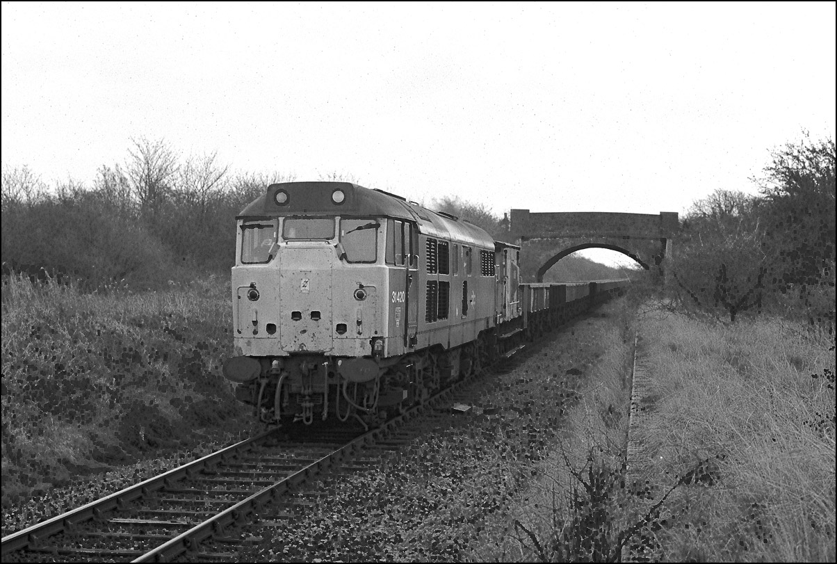 This picture shows 31420 re-marshalling the train which had been split to facilitate unloading. The first half is standing on the branch to Grendon Underwood Junction while the loco is bringing the remaining