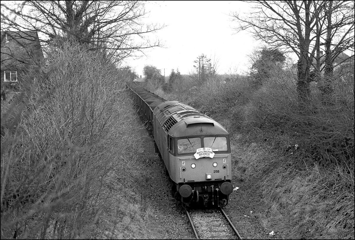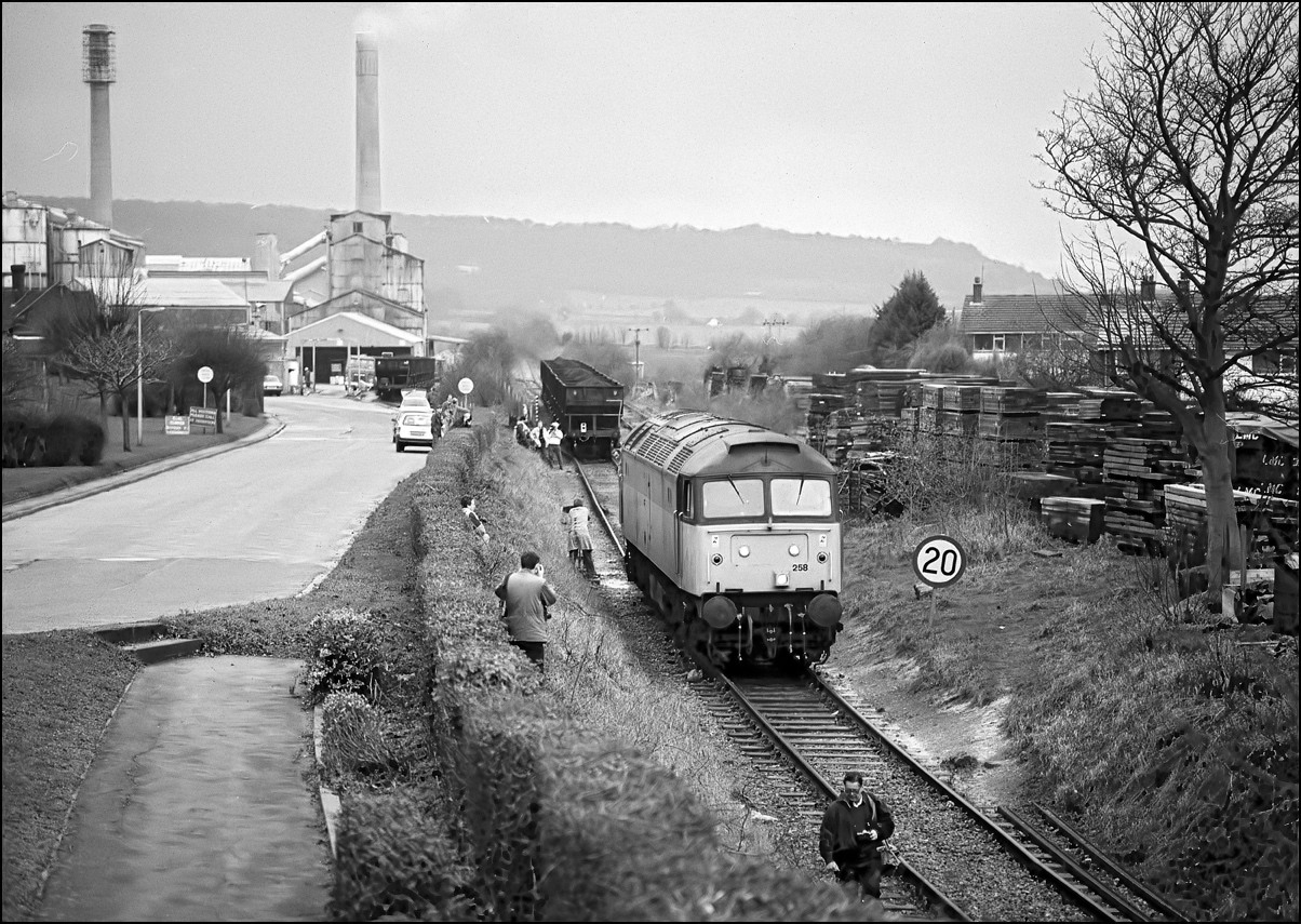 The weather was poor all day and although I did take a few colour slides for the record the black and white images were much better. This one shows 47258 approaching the conveniently placed road bridge which overlooked the cement works in one direction and a tree-lined cutting between housing estates