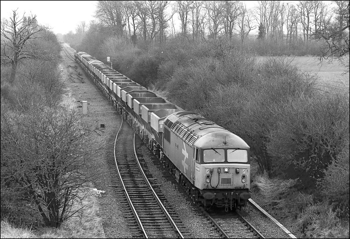 In somewhat better light to that seen in the photograph above, 47146 has just about arrived at Grendon Underwood Junction on 5 January 1991 while propelling its train of empty cargowagons from Akeman Street fertiliser depot. The bridge on which I was standing was situated on a bridlepath and subsequently collapsed to be replaced with a boarded crossing.