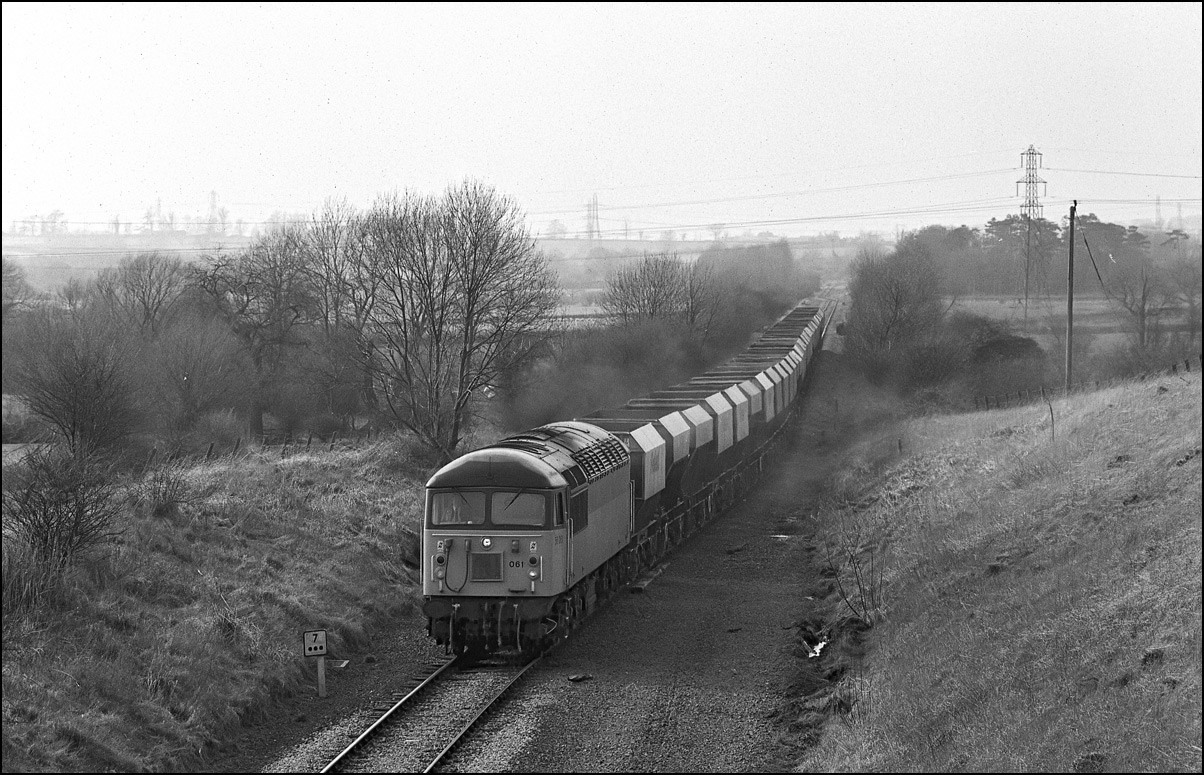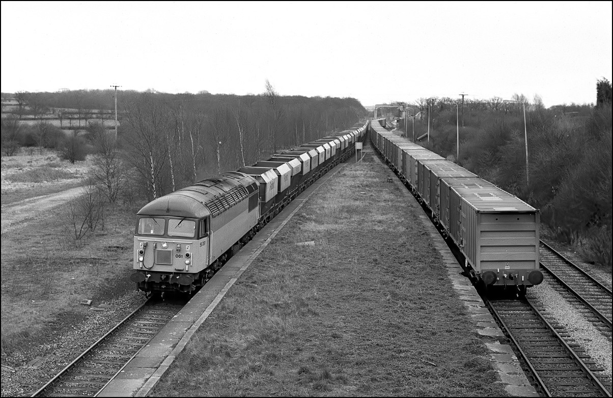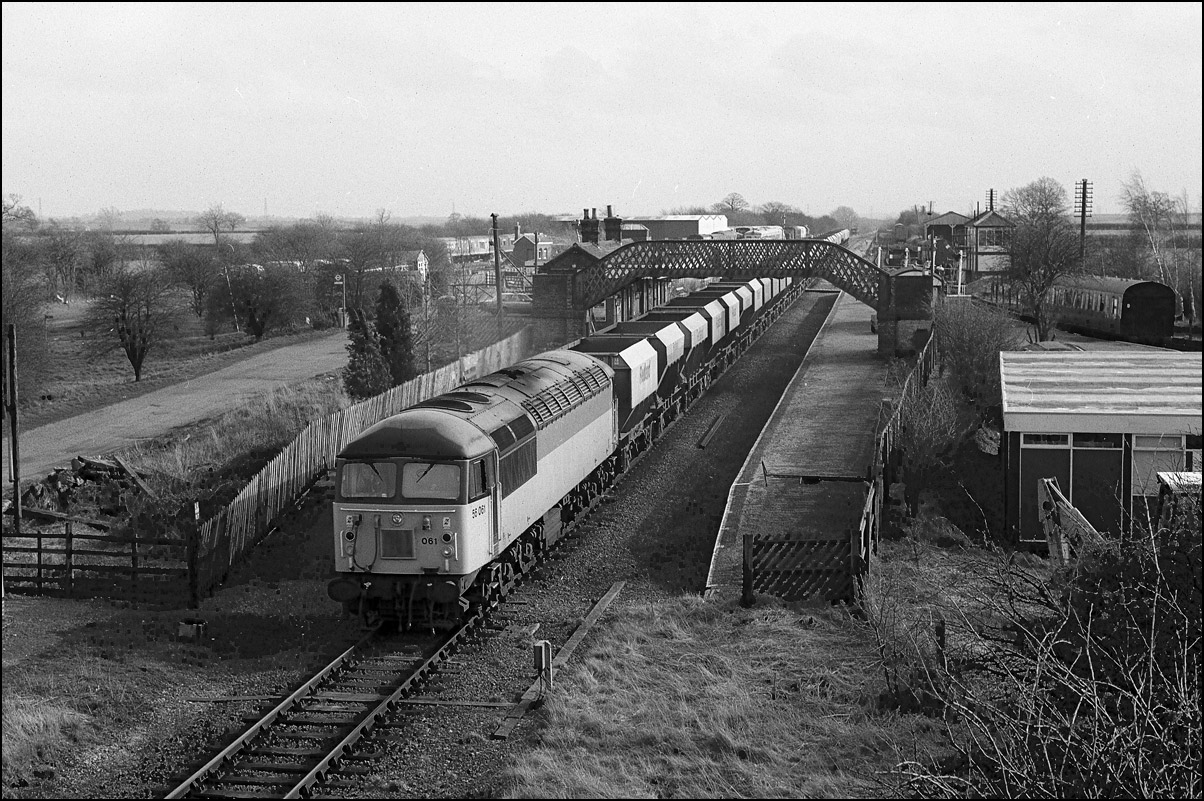 My final shot of 56061 on 17 February 1990 was as the Redland hoppers en-route to Mountsorrel from Aylesbury went past the island platform at the former Calvert station. The rubbish containers from the Northolt train are on one of the