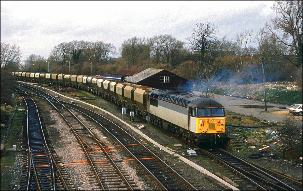 On 17 February 1990 the sun appeared at Aylesbury as 56061 stood outside Aylesbury as the train, empty stone hoppers bound for Mountsorrel,