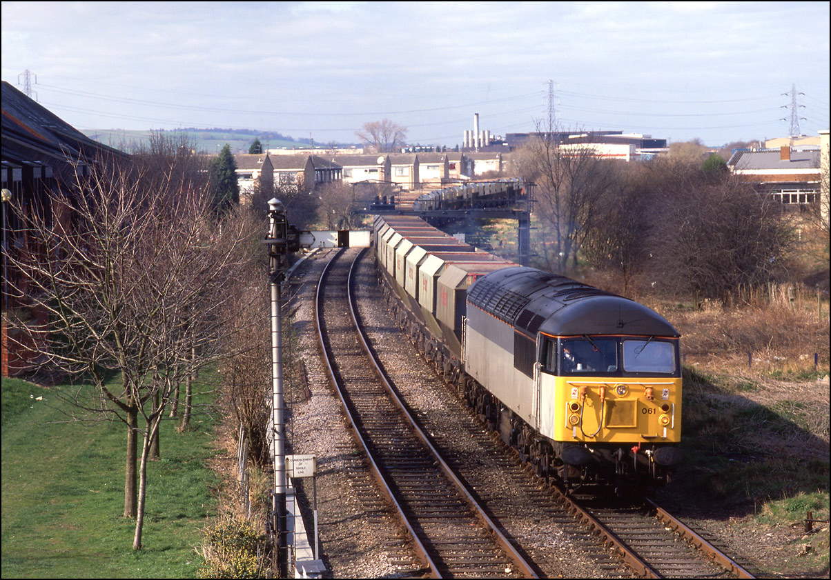 The Mountsorrel to Aylesbury stone train seemed to have an affinity for 56061 as it appeared again on 3 March 1991. This time I photographed it as the train approached Aylesbury station on the goods line/long siding from the terminal prior to the locomotive running round the hoppers. 645