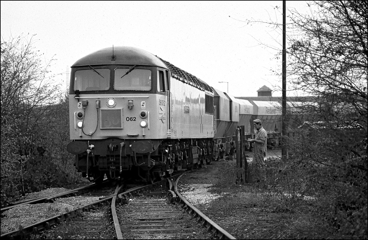 The former coal concentration depot at Aylesbury saw regular stone trains from Mountsorrel in the early 1990s. These conveniently ran on Saturdays and this picture, taken on 3 March 1991 shows 56062 at the exit of the depot as the shunter prepares to oversee the train pulling forward to allow the last wagons to be unloaded.