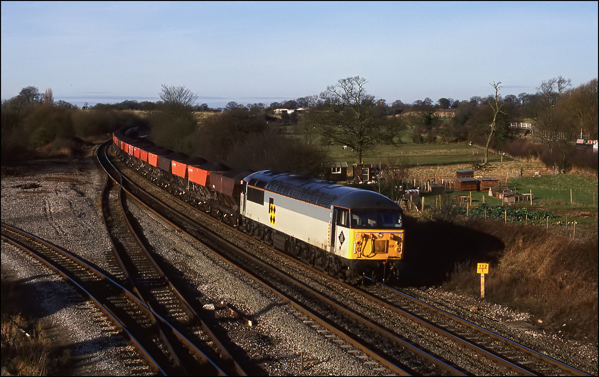 went to Didcot to run around and reverse. On 22 January 1994 56129 appeared on the curve adjacent to Hatton station with one of the usual rake of HTAs. Hatton is convenient for the M40 and a gentle run to Bicester
