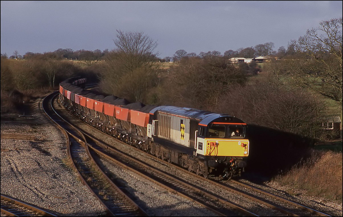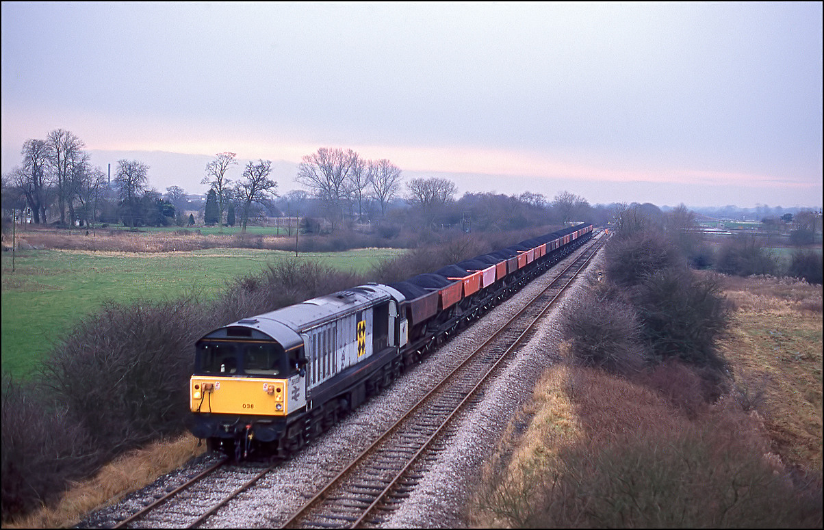 There wasn't any particular class of locomotive allocated to the Toton to Bicester coal traffic and on 8 January 1994 58038 was in charge of the HTAs. As usual I went to Hatton first to ascertain if it was running and took this shot