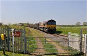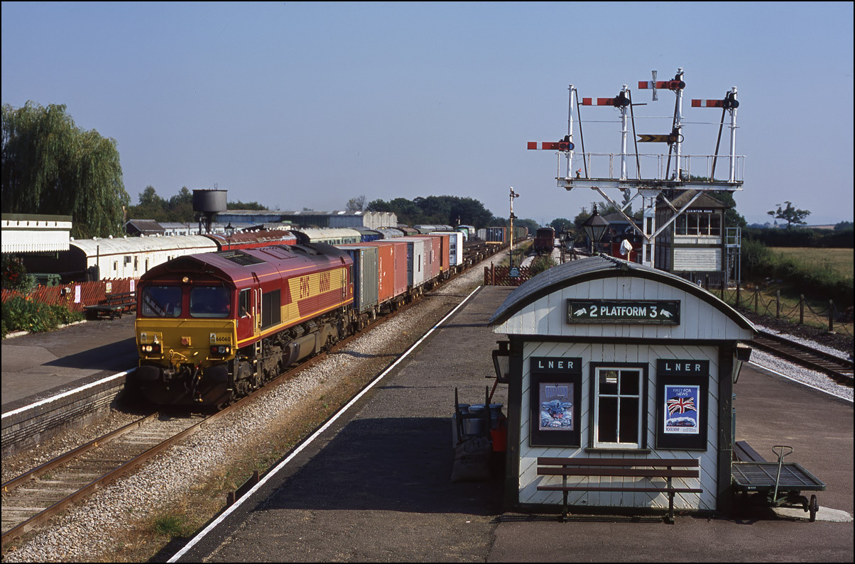 Due to engineering work on the Bicester to Oxford line in September 2003, the MOD train from Didcot to Bicester was retimed and diverted. It ran via the Hanwell Loop, Princes Risborough, Aylesbury and Claydon LN&E loop. I pictured it passing Quainton Road station top and tailed by 66060 and 66054 on 4 September.