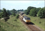 This is a Saturday morning shot of the Whatley to Wolverton loaded stone train, 6M24, passing the site of Swanbourne station on 29 June 1991. This section of line was on a rising gradient for loaded trains and the sound of the 56 was audible for several minutes before the train came into view. I remember this shot well, as I