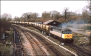 In much worse weather than the two shots above, on 27 October 1987, this one shows 56030 in charge of 6V11 passing Claydon Junction on the main line. The signal towards the back of the train controls the junction to Calvert and Aylesbury