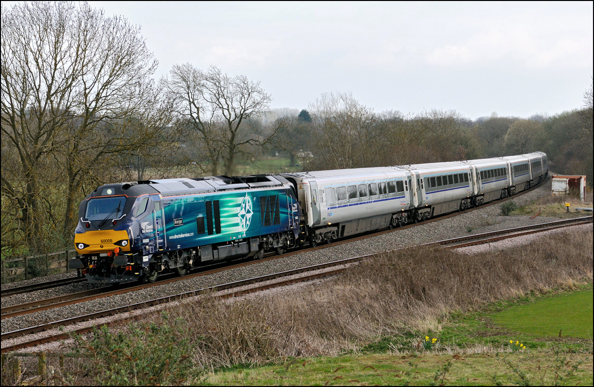 It looks as if class 68 has just about taken over the locomotive-hauled trains run by Chiltern Railways. From the beginning of April 2015 several of the trains previously allocated to class 67s have been in the hands of the new motive power and on Easter Sunday, 5th April, 68008 in DRS colours was in use on one of the diagrams. I didn't know how long this locomotive would remain on the services between London Marylebone and Birmingham Snow Hill so had a trip to Hatton North Junction for a shot of it on the 14.06 down service, 1R42. The light was up and down but managed to be firmly down when I heard the impressive sound of the new order climbing Hatton Bank. There were extra hauled services over the Easter weekend to cater for passengers displaced from the Euston Line by major engineering work but it wasn't possible to see how many were on board 1R42 because of the tinted windows used on the "Silver Set". I imagine that some passengers were enthusiasts getting some DRS liveried 68 mileage under their belts as this will be a lot more difficult than Chiltern branded examples without a trip to Scotland. |