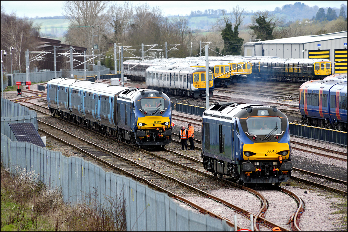 It seemed that departure time for 5Q86 at Long Marston on 24 March 2026 was likely to be one hour late when things began to happed with 68016 being started, moved away from the other stock and placed in road no.1. Quite why 2 locomotives were sent wasn't clear as an operational DT was on the back of the set as required for a reversal at Honeybourne and the journey south up the North Cotswold Line towards Oxford. |