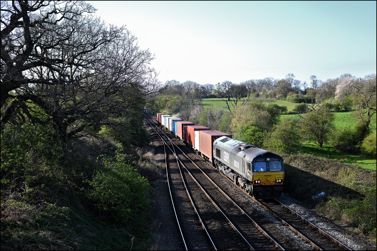 Former European class 66 was the last of the class to be converted to UK specification for GBR and on 8 April 2026 it was working 4O32, the 15.56 Hams Hall to Southampton. Its colour scheme doesn't work well with backlighting but with a decent background and loaded flats at the front of the train it was worth a shot at Hatton North Junction. |