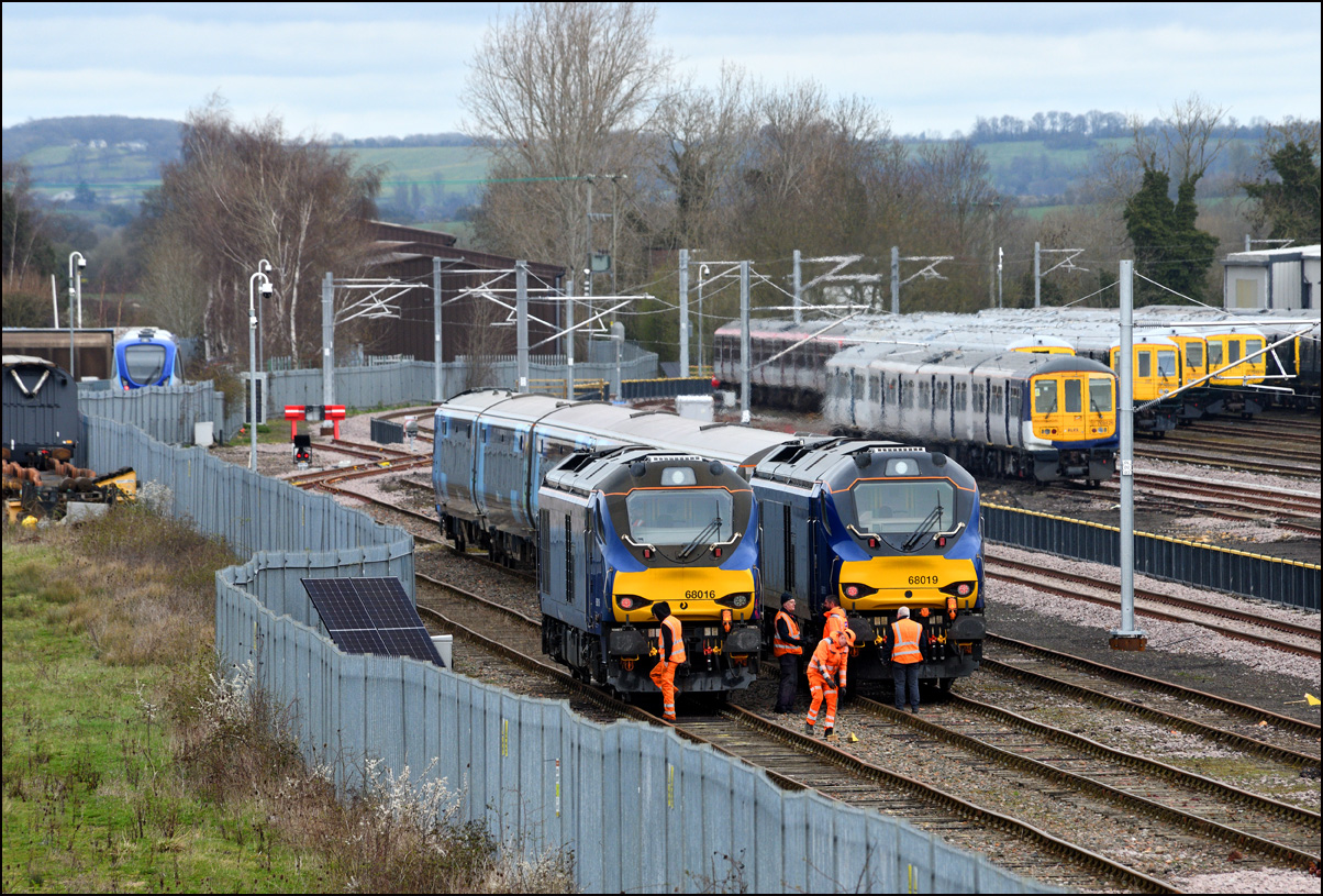 Most weeks see schedules in the system for Longsight to Long Marston trains taking Mk5A stock for storage but in recent times these have rarely run. There was an exception on Wednesday 5 March 2025 when 68019 did work and with a sunny day looming it was worth going for a shot. I hadn't managed a picture of one of these in good light since January 2024 when the class 68 and stock were topped by 37884. Today's 5Q94 was hauled by debranded and very clean 68019 which was a bonus in the lovely light. |