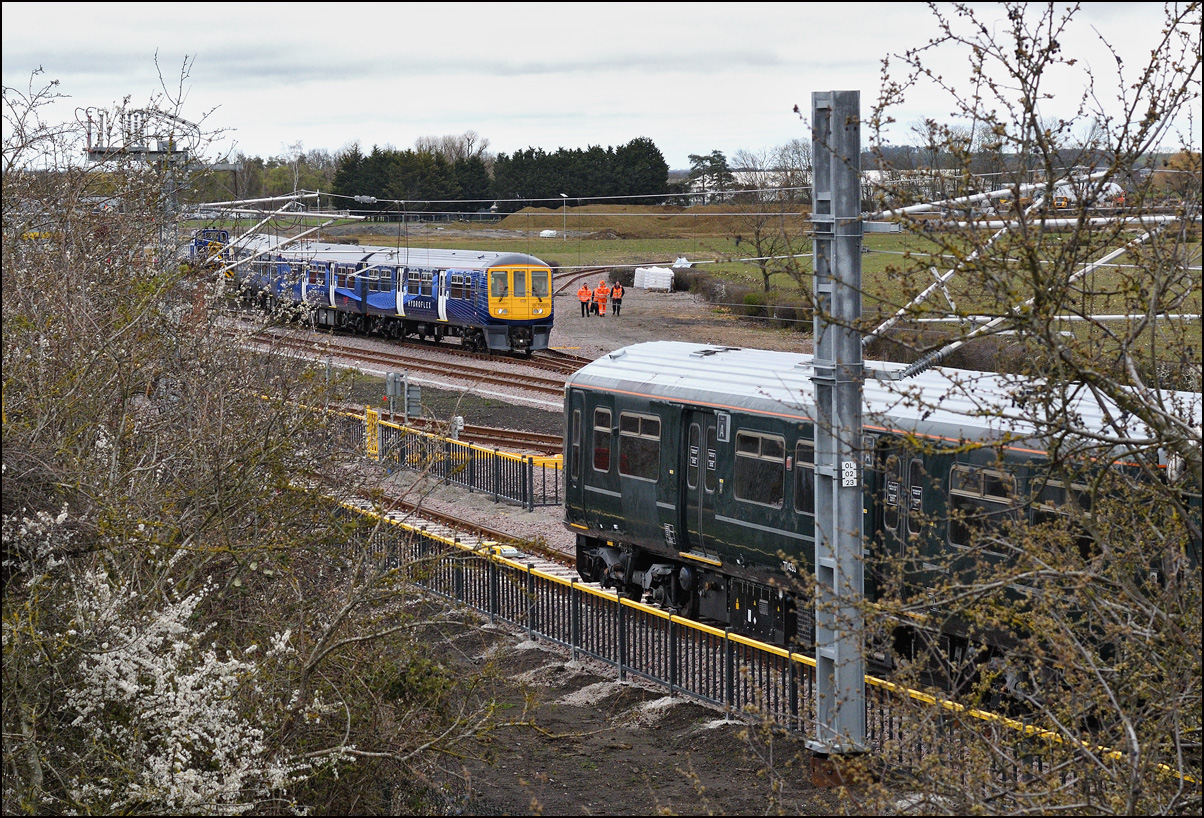 Before leaving Long Marston for Honeybourne on 2 March 2026 to wait for 69009 with 5Q70 I took a shot of the class 350 EMUs standing on the far side of the newly electrified tracks to be used by Porterbrook to test new stock. I'm sure that it's not deliberate but the units have been placed in such a way that the numbers are clearly visible to anyone interested using either a long lens or binoculars. |