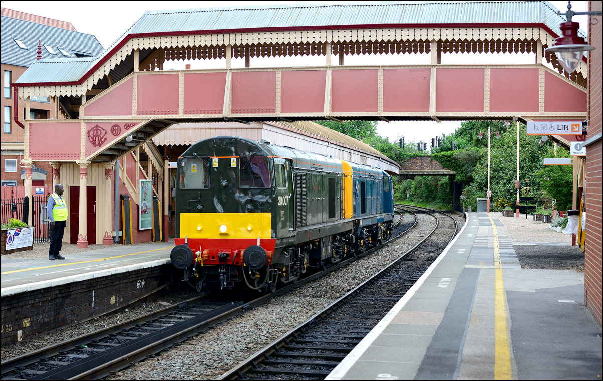During a quick trawl of RTT on the morning of 18 May 2022 I noticed that an 0Z21 was running to Stratford-upon-Avon to Stratford-upon-Avon via Kidderminster. It was operated by LSL and at a guess would involve a pair of class 20s from Butterley. I watched Railcams as 0Z21 reversed at Kidderminster and saw that the locomotives were blue 20205 and green 20007 and although running about 30 minutes late it seemed likely that most of the time would be made up between Birmingham Snow Hill and Stratford. Even though it was just a light engine move I went to the station and had to decide whether 0Z21 would run into platform 1 as booked or use P2 because of trains from both Birmingham and Leamington Spa being on their way. I hedged my bets and stood in the middle of the footbridge until the 20s appeared leaving time for both alternatives. The schedule was followed and here are the pair with 20225 leading slowing down for a reversal and return to Tyseley LMD. |