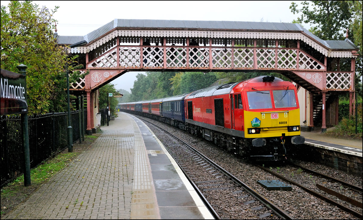 If I thought that the weather was bad when 60059 arrived at Stratford-upon-Avon on 25 August 2014 then it was a lot worse when it left at 16.15. The sky was much darker and the rain a lot heavier when I arrived at Wilmcote station for a photograph but I decided to get a bit wet and take my shot from the platform to include the attractive station footbridge, despite its rather dodgy colour scheme, in the picture. I heard 1Z61 climbing the 1/75 of Wilmcote Bank and the train soon appeared through the murk and rain on its way back to Leeds, this time running via Hatton North Junction and Solihull. If the weather had been clear and sunny I would have gone to the former where it would have been interesting to have had a comparison picture to this one of 60096 leaving the Stratford branch in March 2006. |