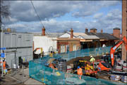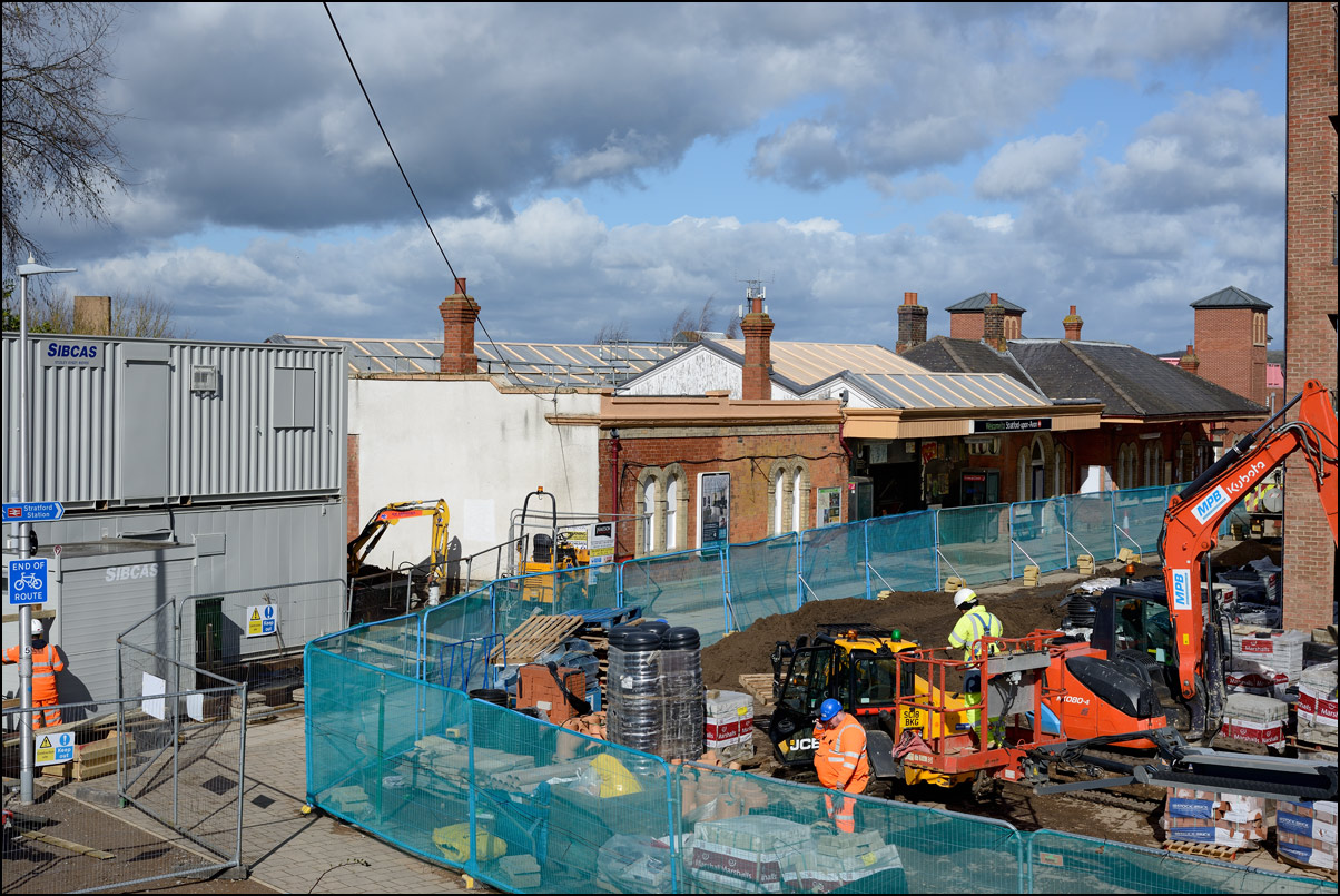 The GWR station at Stratford-upon-Avon is in the early stages of a complete refurbishment. Contractors have erected some temporary buildings between the station building and the road bridge, some of which can be seen in this view. The chaotic mess on the foreground and right of the image is where the builders of the horrifically designed and executed new high-density housing scheme looming gloomily over the whole area have taken over most of the foot and cycle access to the station, covering the whole concourse with mud and debris. I hate to think in what state the new paving will be be left bearing in mind the standard of building work on the new estate. |