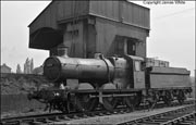 Another of James's pictures at Stratford-upon-Avon's coaling stage shows Churchward designed 2-6-2-Prairie tank 4133 with a trace of steam from the whistle about to move away after its bunker has been refilled. The 22,500 gallon water tank on top of the building and another on the other side of the station near Stratford West signalbox, were filled from the GWR-owned Stratford canal with the inlet placed near Wilmcote and above the short flight of locks made necessary by the town's position in the Avon Valley and the consequent gradient going north. The shed's water crane, one of four in the station area, was a few yards in front of 4133. |