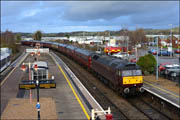 An earlier visit to Stratford by 37418 was under more unusual circumstances. The locomotive hauled a private charter to mark the retirement of a senior executive from his post within an international oil company. As an added point of interest, 37418 was renamed "Gordon Grigg" before the train departed from Kensington Olympia on 11 March 2002 form whence it ran to Stratford where the guests alighted and were ferried to a hotel on the outskirts of the town for lunch. The ensemble is here seen stabled in platform 2 headed by the specially cleaned ETH machine. |