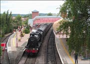Turning around from the picture shown above, this is the scene as MPV 98959 leaves Stratford-upon-Avon en-route to the West Midlands. The pile of sleepers just visible beyond the train roughly marks the site of the proposed steam centre it is hoped to build here. This would apparently be a major attraction for the general public and would include a turntable to avoid the need for either a trip to Hatton and Dorridge for reversal via a triangular junction, or tender-first running. There would also be a servicing facility operating as an outpost to the museum and workshops at Tyseley. The planning application for this site was recently withdrawn to allow for the plans to be re-drawn. The original submission made insufficient allowance for parking and for adequate access and egress to and from the site. Anyone who has tried to leave Station Road in order to head away from Stratford-upon-Avon at a busy time will know the problem faced here... |