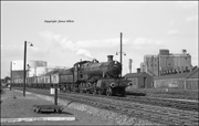 Despite the procession of passenger trains to and from the West Country and South Wales, there were still freight services for the hard-pressed signalmen to fit in on the route through Stratford. Here is GWR 2-8-0 2883 from Tondu restarting a freight for Severn Tunnel Junction and passing through Stratford station. Virtually all down freights would have been routed into the down goods loop for watering and to get them out of the way of passenger trains and the rear of this train can be seen snaking onto the main line as it leaves the loop. There was less flexibility for up trains and if a faster service was approaching from behind, a freight would have had to have been propelled into the refuge siding by the West Box after running into the station to clear the appropriate points. These immensely powerful freight locomotives sounded magnificent when working hard although at this point 2883 would have been running very slowly until the last wagons had cleared the loop. Even then, it would have run cautiously as the gates of the Evesham Road crossing a little further south may not have been opened and the distant signal would probably still have been at caution. Brian Morrison |