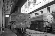 This is the interior of 84E, Stratford-upon-Avon GWR engine shed. The 2 pannier tanks had been withdrawn and were on their way to Bird's yard at Long Marston to be scrapped and the Midland 4F just visible would have come here for servicing after the Old Town shed had closed. The spot upon James was standing was about to be occupied by Collett 0-6-0 2211 which had just been coaled and watered. |