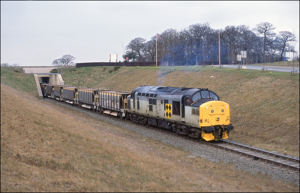 This is 37515 passing Tutbury & Hatton on the Uttoxeter line on 13 April 1995 with an additional working from Tees to Etruria. The shot was taken using a 210mm lens in order to compress the perspective and bring the interesting background into clearer view.