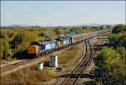 6M67, the Bridgwater - Crewe nuclear flask train was running in the region of an hour early on 2 November 2007 when it came north past Defford in Worcestershire, passing Defford at 13.38 behind 37510 + 37194. I can't admit to getting fired up by these very short trains, despite the in-vogue motive power, but