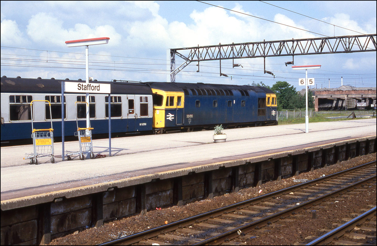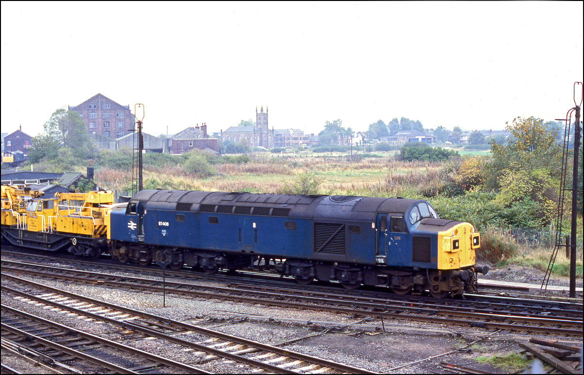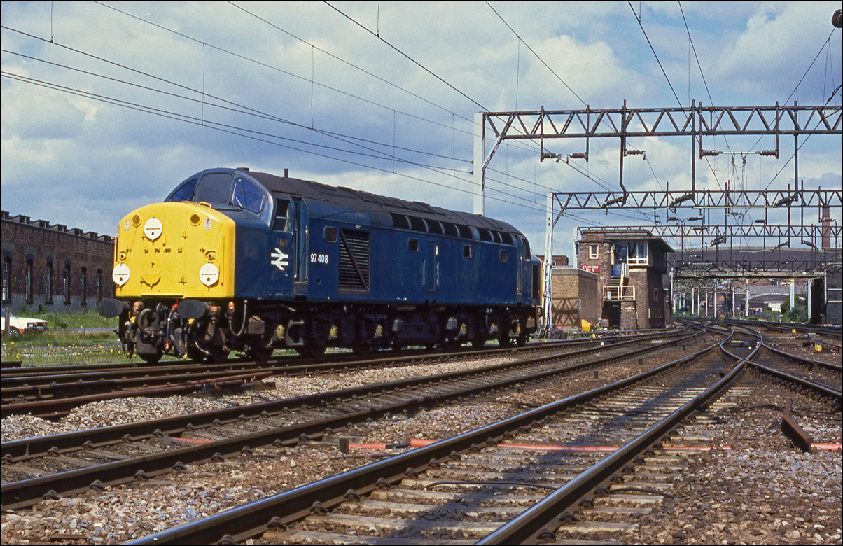I had just arrived at Stafford on 11 June 1985 when a cleaned-up 97408 (40118) ran through the platforms after arriving with a ballast train from the Stoke-0n-Trent direction. I don't always take light engines but this ws my first sight of a recently withdrawn class 40 temporarily reinstated as part of the departmental fleet. |