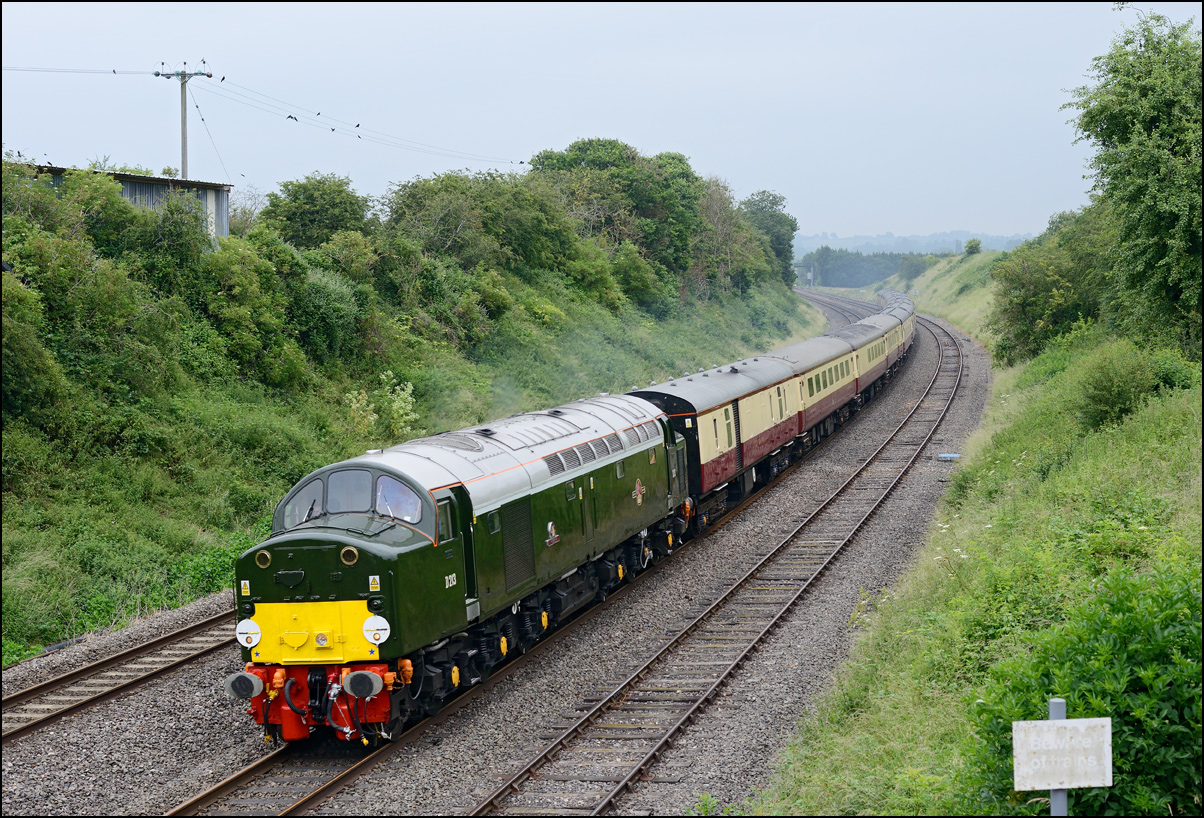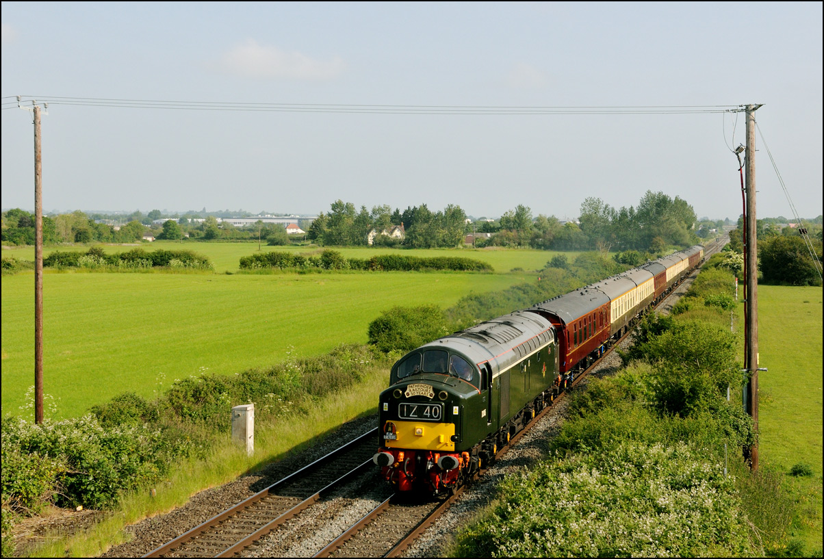 To mark 50 years of Pathfinders (formerly F & W) Railtours a specially anniversary train was run from Burton on Trent to Weymouth. Somethin a bit special was clearly required to haul it and LSL's 40145 was the chosen locomotive. I chose to go to Claydon in Gloucestershire with the idea that there probably wouldn't be many other photographers there and sure enough there was just the one. The train, 1Z40, with 47815 on the back to help shunt at Weymouth and probably give a shove up Sapperton Bank, ran on time and passed at a very good rate of knots making a fair old noise. I took a short video clip which suffers a bit from wind noise not to mention my camera in rapid-fire mode! |