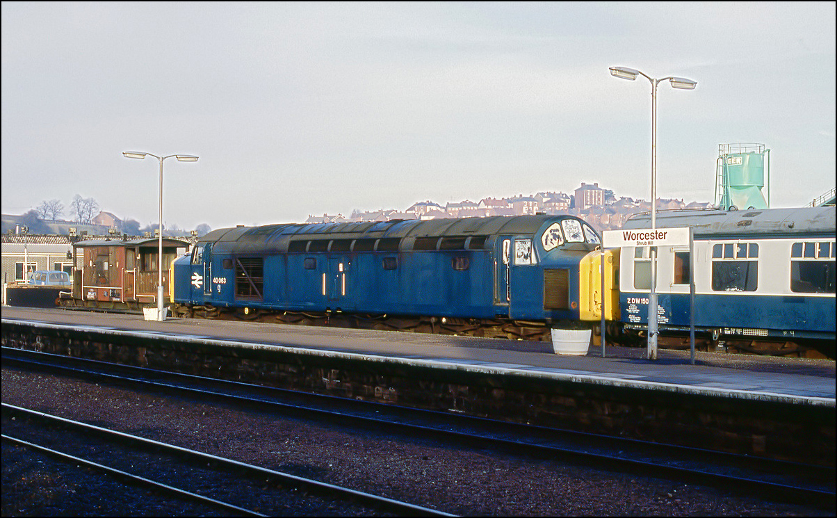 The running in 2006 of a railtour with the title "Christmas Cracker" using the beautifully restored 40145 reminded me of the original tour which ran on 15 December 1984. Here it is, with 40118 in charge, passing Worcester Shrub Hill station with the locomotive being given a large handful of regulator as the curve at the Birmingham end was cleared. Class 40s were not unknown at Worcester as occasional visits were made with the vans from Birmingham Curzon Street which conveyed parcels for a local catalogue company. I don't have any good photos of this, but do recall seeing 40044 on the job one Saturday morning. Click on the hyperlink to see a shot of 31289 on 3V16 taken on the same day as 40118. |