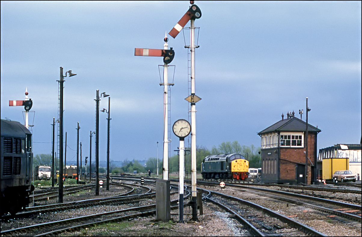 After taking the picture shown above on 25 April 1985 I caught the next up train to Banbury and took this rather poor quality shot of 40122 standing by the signalbox. This scan is cropped to above 25% of the full size file with some loss of resolution but the signals and platform-end clock make it a bit more interesting now that all this infrastructure has gone. A class 31 is waiting for a path south and the signalman's Austin 1800 is to the right of the 'box. |