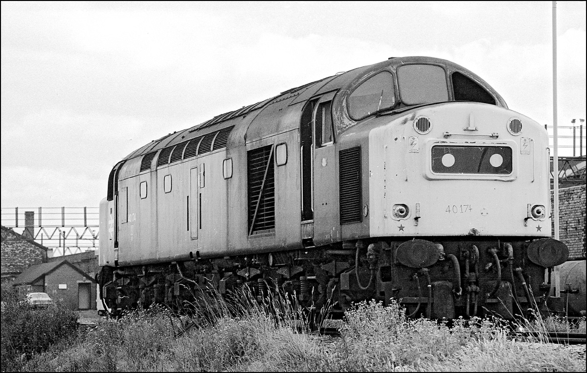 During one of my trips to Manchester in May 1984 I was chatting to a local class 40 enthusiast who said that he was going to have a look around Longsight depot and would I like a trip with him. Depot visits have never really been my thing but this seemed a good chance to get photos of a few more class 40s. Here is withdrawn 40174 waiting to be taken for cutting. |
