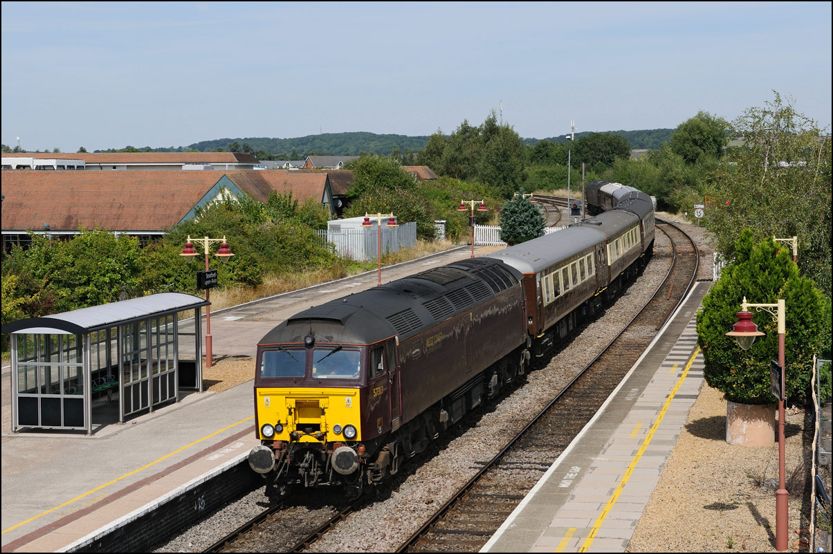 After leaving Hatton 1Z50 ran to Warwick where it waited on the up line until Chiltern's 1R45 had passed by on the down line. It then, with 40145 now leading, used the emergency crossover to gain the down line before starting the run up Hatton Bank. The light was dreadful and a wet and muddy walk to Hatton North Junction seemed pointless so I decided on this shot as the train ran through the platforms at Hatton station; an easily recognisable location rather than some attractive but slightly featureless countryside. I'm not one for adjectival excess in photo captions but will say that it was good to see and hear the elderly English Electric locomotive hauling 10 coaches and a dead class 57 climbing the 1/110 gradient with a decent show of exhaust. |