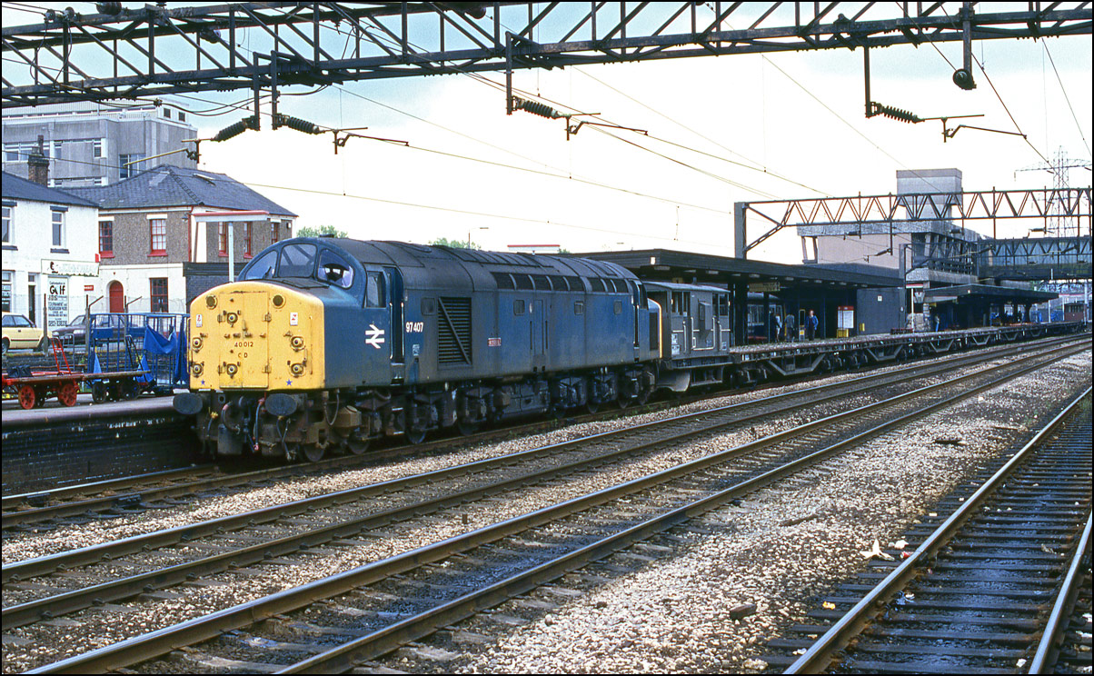 Towards the end of its working life on the mainline 40122 did many special runs and was even employed on one of the Cardiff to Crewe locomotive-hauled diagrams for a few days in May 1987. On the 25th of that month I went to Shrewsbury and instead of going for the usual shot around Sutton Bridge Junction climbed the steps to the ramparts of Shrewsbury Castle where there is (or was - I've no idea what's it's like in 2019) a splendid view over the Western side of the station. This was long before the days of the current fad of taking every shot from a great height, whether appropriate or not, but it did make a change from the usual perspective. Here is D200 about to make the station stop along with 47645 (I think) waiting to leave on a Shrewsbury to Euston express. |