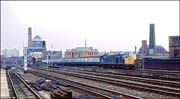 This photograph was taken on 1 November 1984 from the old platforms at Manchester Exchange station and shows 40079 taking a short train of vans to Red Bank. Once again the background really makes the shot and is vastly preferable to me than some green but anonymous countryside. I was quite lucky with the sun all day as most trains appeared in between cloudy intervals - nice to have the luck this way round for a change. |
