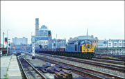 It was also dark in Manchester on the late afternoon of 1 November 1984 when I took this picture of 40168 on a set of old 4 wheel mineral wagons. It so dark that the red signals, including the old-style searchlight variety, show up more than usual. This image was barely worth the time used in scanning and post-processing but time has lent some added interest to the scene. |