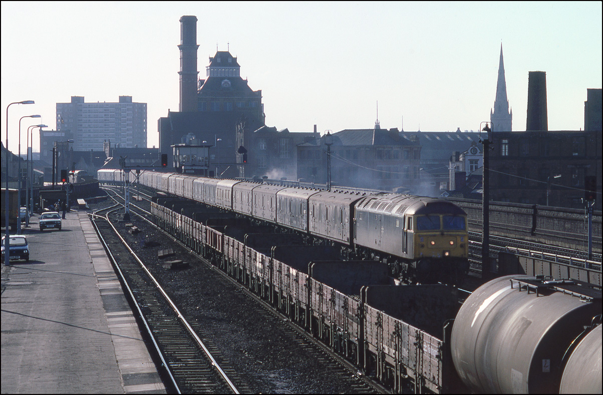 This was such a commonplace and everyday scene on 1984 that I don't think many people bothered to take photographs like this. It shows 47606 Odin, complete with WR nameplate, leaving Leamington Spa on 8 December 1984 with the 09.58 Manchester Piccadilly to Brighton service, which was running 20 minutes late