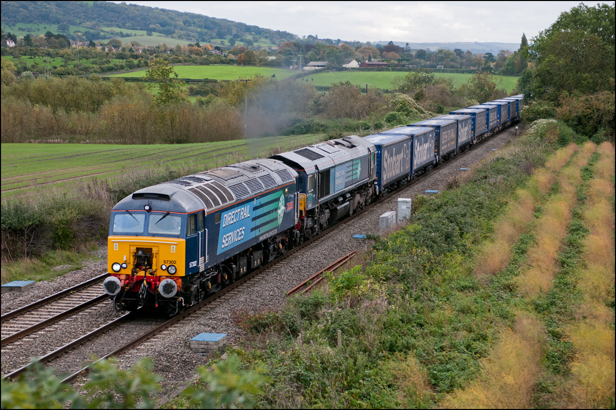 was a couple of minutes late when it passed the autumnal asparagus field at Defford with 57302 putting up a good show of exhaust as it ran north towards Abbotswood Junction. The only other occasion when this train was not in the hands of a class 66 was