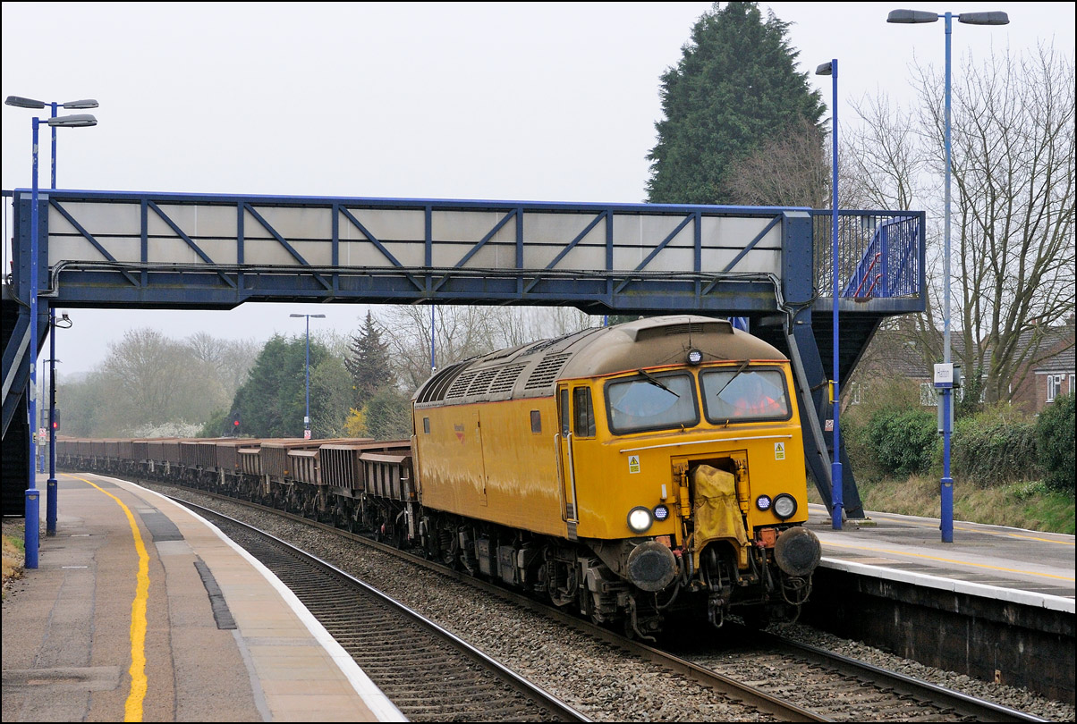 lucky locomotive was 57005. 6Z75 is here seen passing the site of Defford station, near Pershore in Worcestershire, in a patch of sun that came from nowhere in an otherwise stormy sky. The wagons are KEAs and in a previous life this one still with a Trans Manche Link roundel was used to transport Channel Tunnel lining segments around Kent. Much