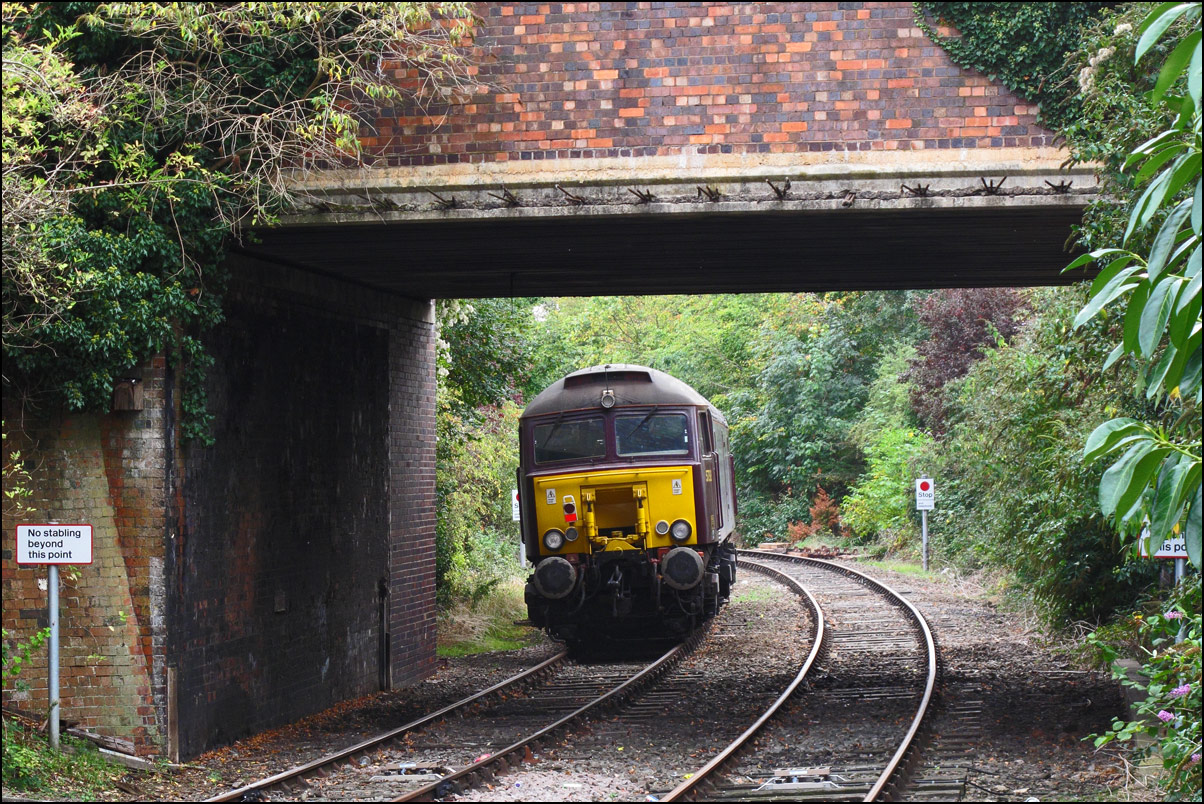 and I had to bump up the ISO to 800 to ensure a high enough shutter speed to get a sharp image as the train went towards Honeybourne North Junction under a green signal on its way to Worcester for a run-round before going off to Newport.