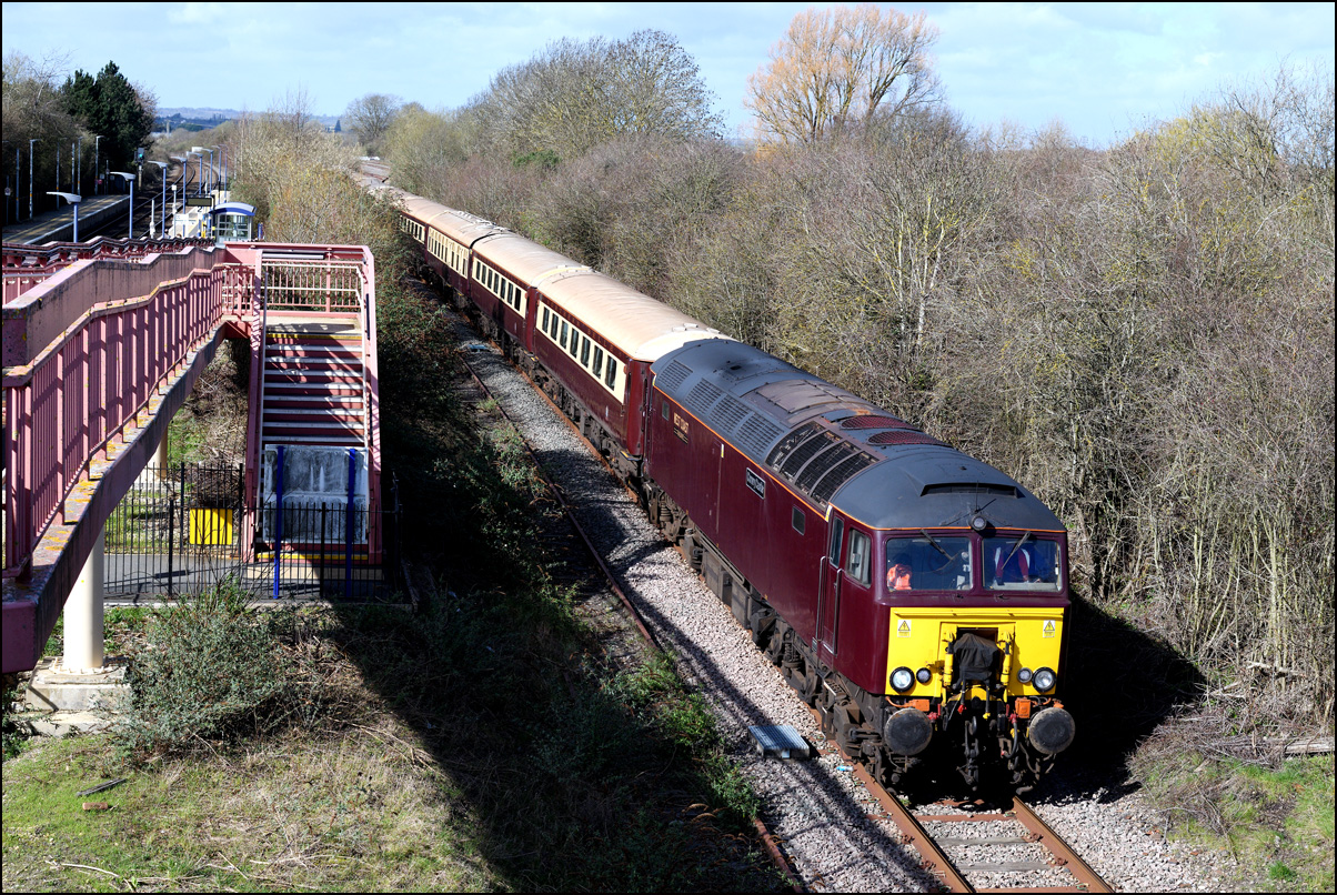 The departure of 1Z74 from Stratford-upon-Avon when it headed for Oxford was scheduled for 14.10 which had given the passengers plenty of time for some lunch and a look around the town. The train was headed by 47854 and is here seen at Songar Crossing