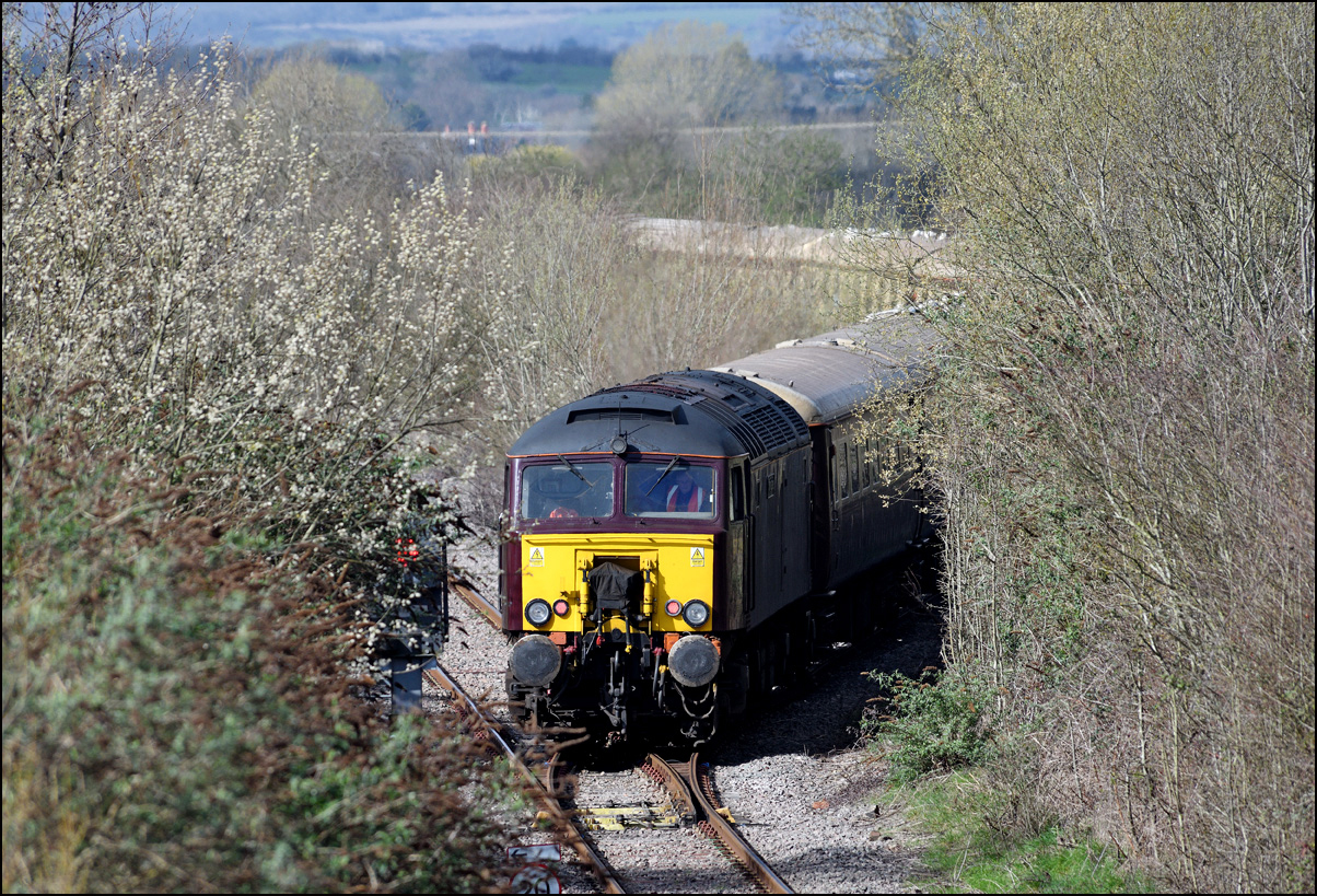 I don't usually take "going-away" pictures but did take this one of 57601 as it tailed the train through the newly blossoming blackthorn bushes along the line because class 57s are not exactly commonplace hereabouts.