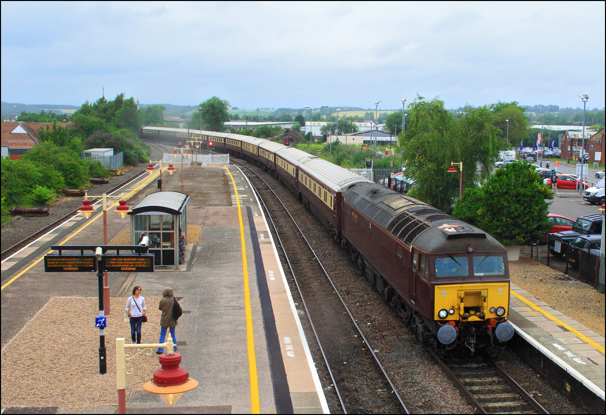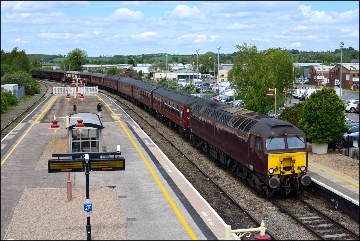 a location with a solid background is the best bet so I went to Evesham station and arrived on the down platform just as 1Z68, the 07.11 from Scarborough to Oxford came under the roadbridge some 9 minutes early. I just had time to get organised and take this image with 57313 topping and tailing 57314 and a nice mix of maroon and chocolate and cream stock. The composition of the photograph suffered
