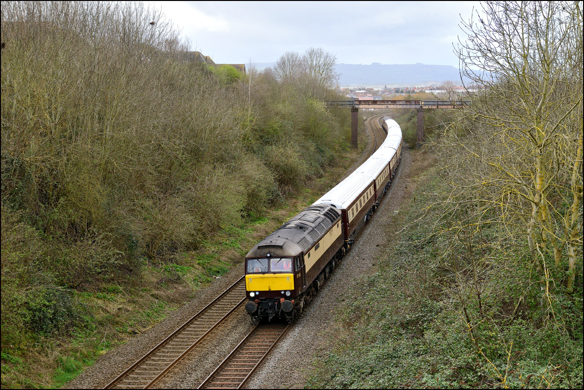 An unadvertised charter from Carnforth to Oxford was scheduled to run up the North Cotswold Line on Saturday 16 March 2013 with WCRC's 57601 + 47786 topping and tailing a short rake of six Pullman coaches. The weather earlier in the morning, when I went to Hatton to photograph