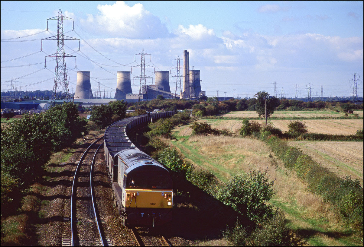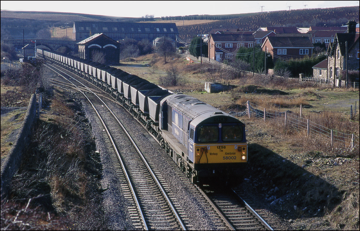 The vast majority of class 58's work was hauling heavy MGR coal trains around the network, especially the East Midlands area. This image shows 58002 shortly after passing the