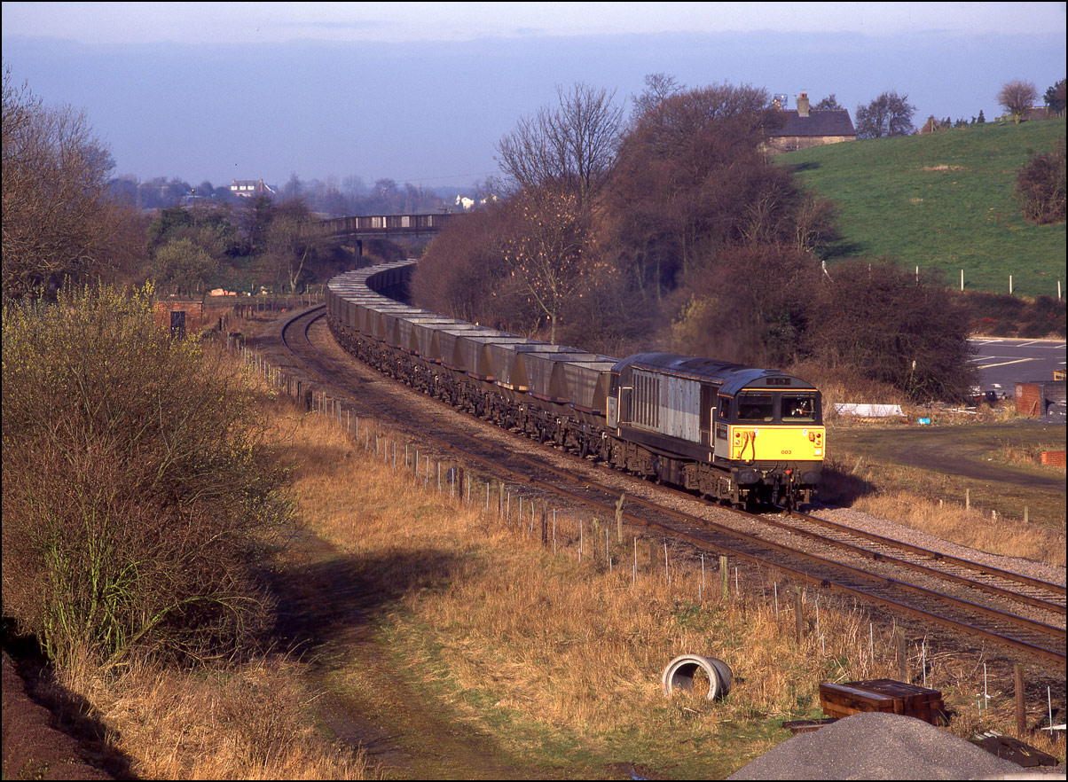 The Coalville line which runs from Burton-on Trent to Leicester was visited on a daily basis by class 58s on MGR duties. 58003 is seen here near Castle Gresley with the first empty train of HAAs of the day, 21 March 1995, heading for Coalfield Farm loading point.