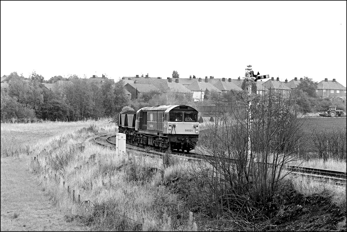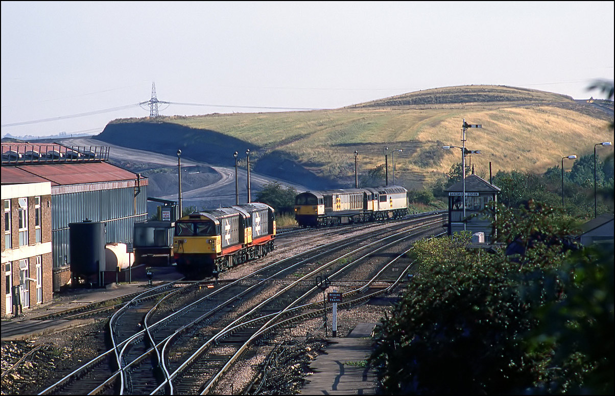 58021 arriving, probably from Nadins opencast site, and 58031 departing for Toton. By this time, the signalbox was treated as a ground frame and operated by the train crews.