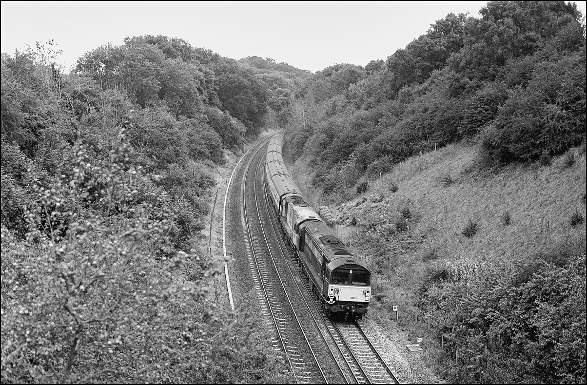 was 11.15! The use of 58s was unusual as a single 60 was the booked traction at the time so a pair of of bones, both under power, was doubly noteworthy. To see how this this scene has changed in 8 years, use this link for a photograph of 66542 on