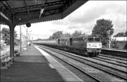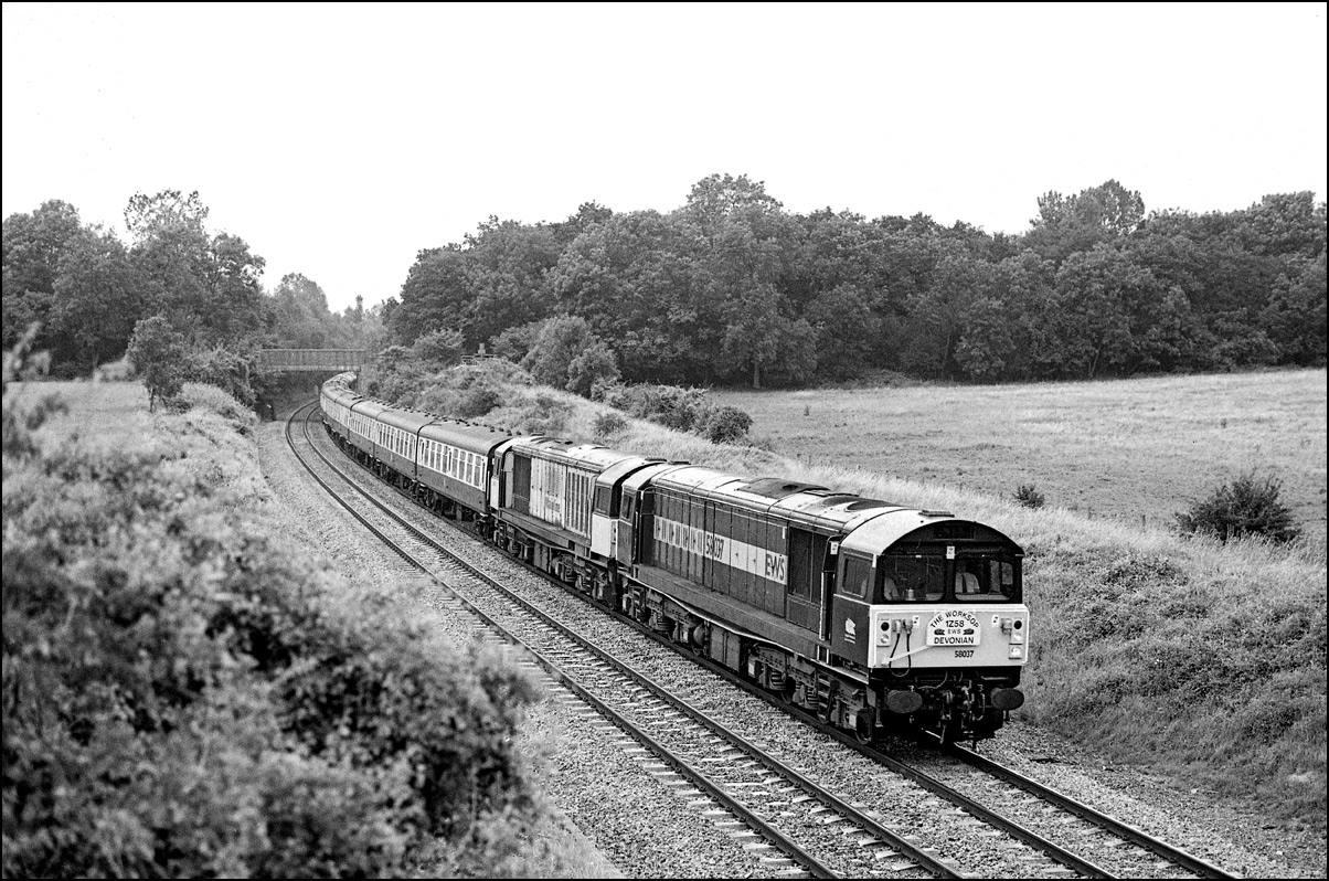 This picture shows 58025 on a highly unusual working for the class. The train is the summer-dated Manchester to Paignton Pullman passing Longbridge on 26 July 1986. This train was booked for a pair of ETH-fitted