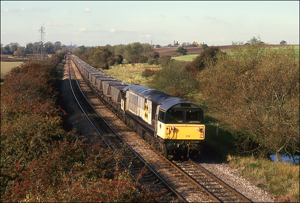 Back to normal for class 58 as 58038 takes and empty MGR from either Rugeley or Willington Power Station to one of the East Midlands coal loading points. This scene was so ordinary at the time